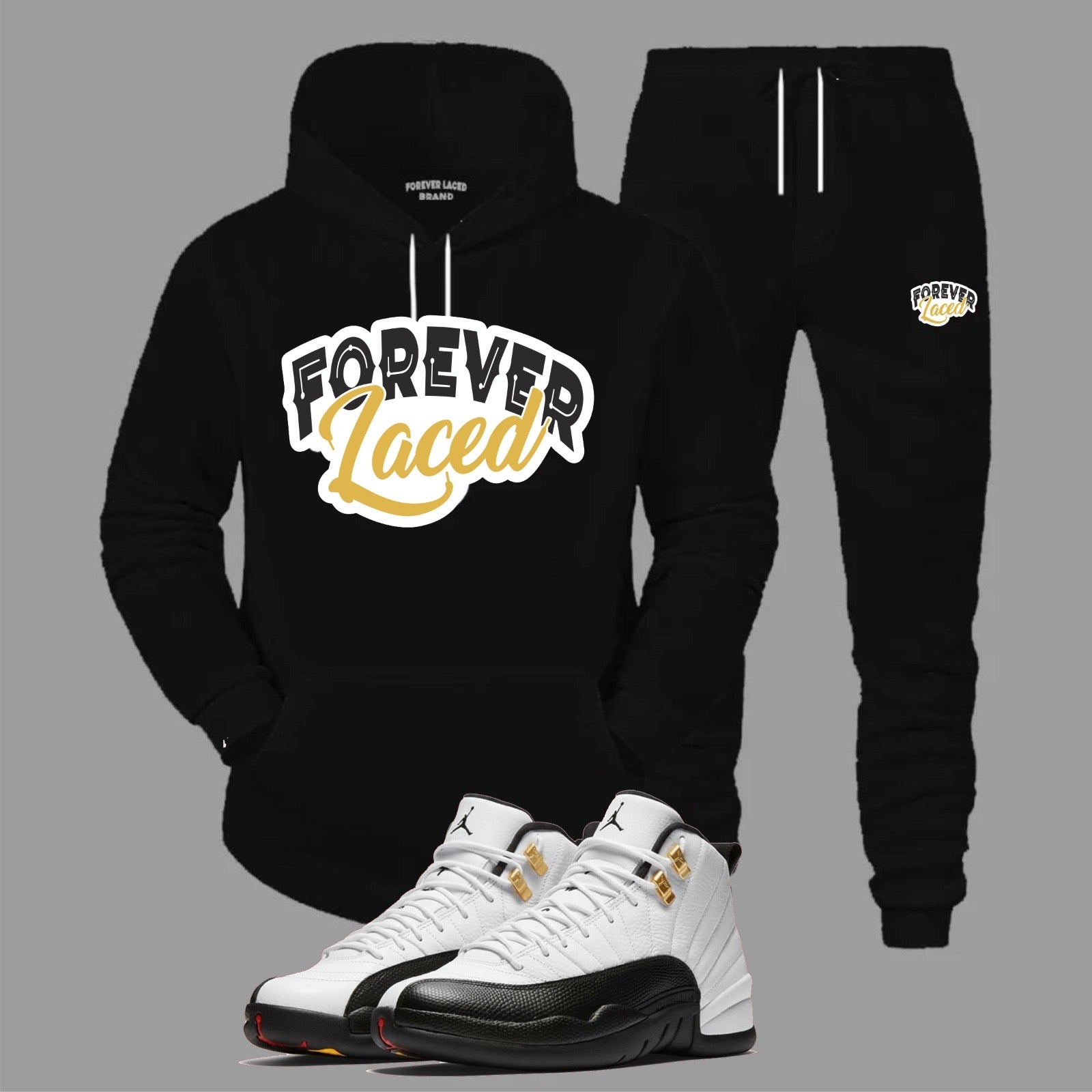 You are viewing the Forever Laced Hooded Sweatsuit to match Retro Jordan 12 Taxi sneakers. This Sweatsuit is Cotton Fleece and the fit is true to size.