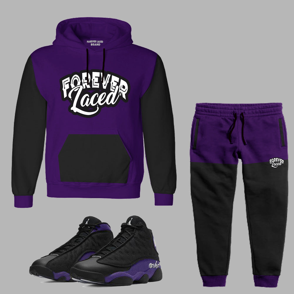 You are viewing the Forever Laced Hooded Sweasuit to match Retro Jordan 13 Purple Court sneakers. This Sweatsuit is Cotton Fleece and the fit is true to size.