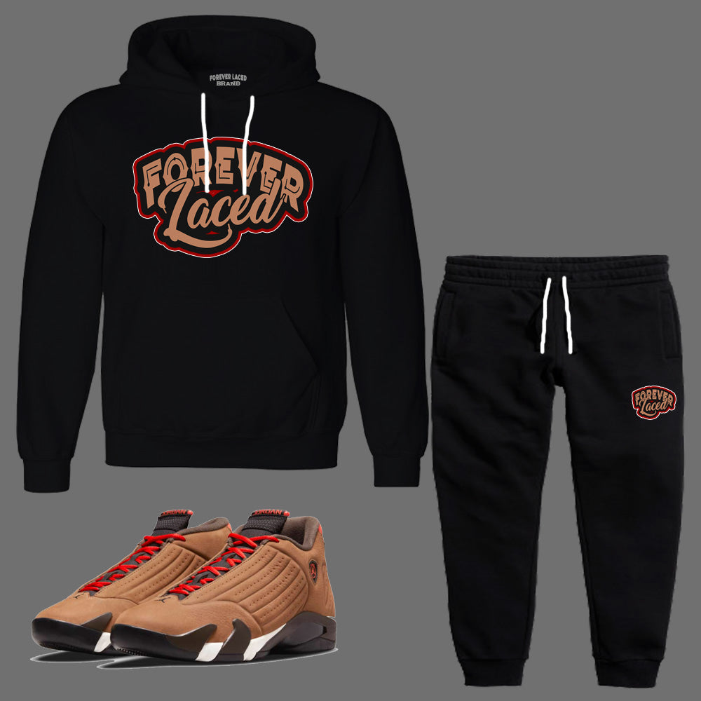 You are viewing the Forever Laced Hooded Sweatsuit to match Retro Jordan 14 Winterized sneakers. This Sweatsuit is Cotton Fleece and the fit is true to size.
