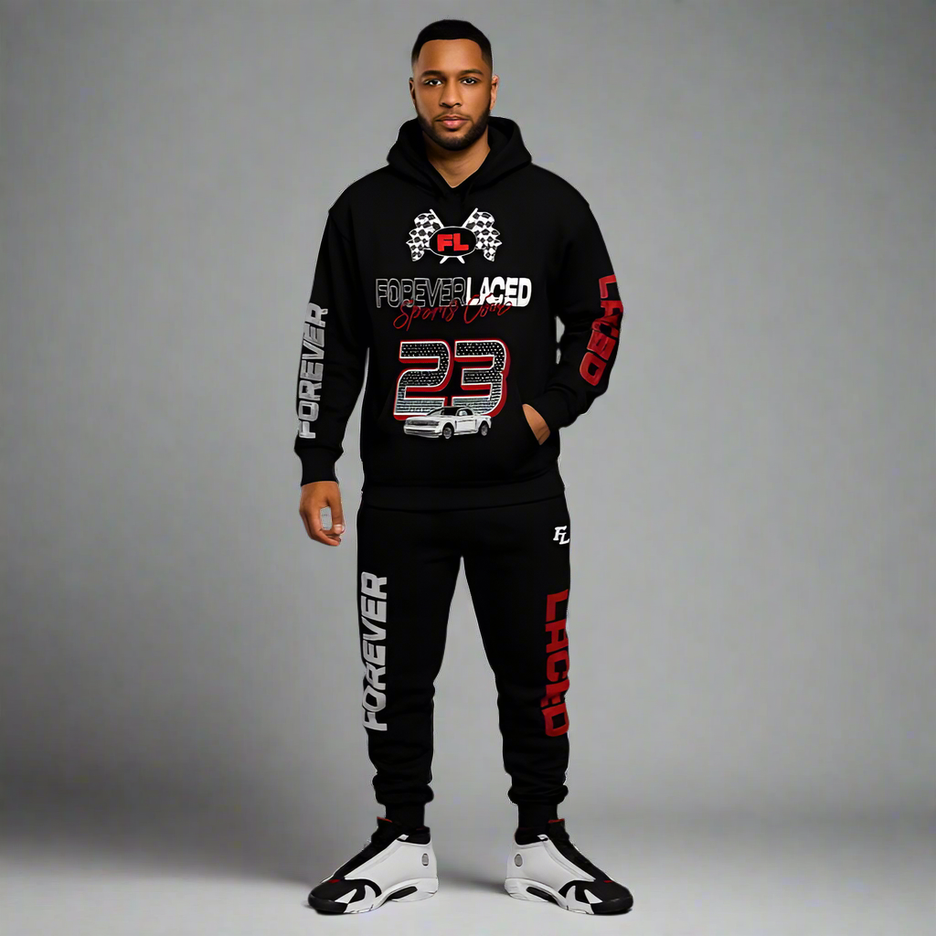 You are viewing the Forever Laced Sports Club Sweatsuit to match Retro Jordan 14 Black Toe sneakers. This Sweatsuit is Cotton Fleece and it includes a Zipped Hoodie and Sweatpants.